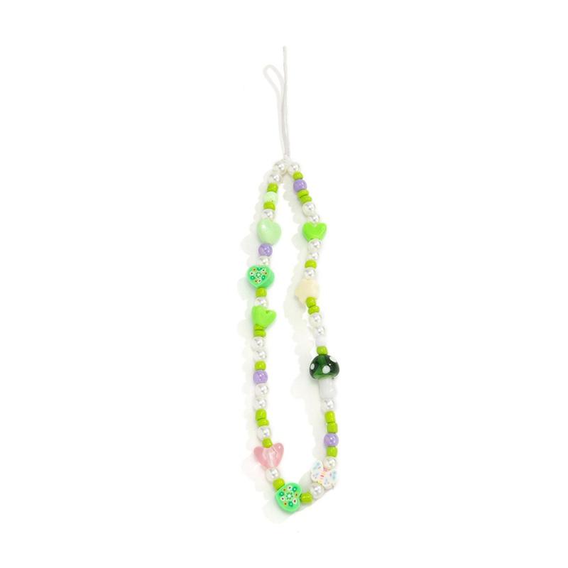 Telefoonkoord / polsbandje met paddestoel- en parelkralen - 20cm - Groen