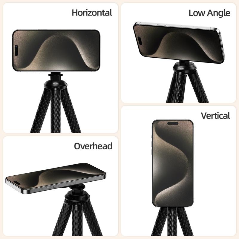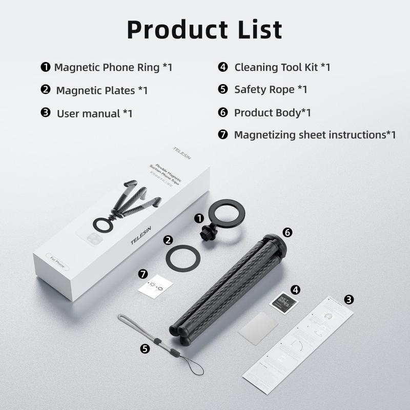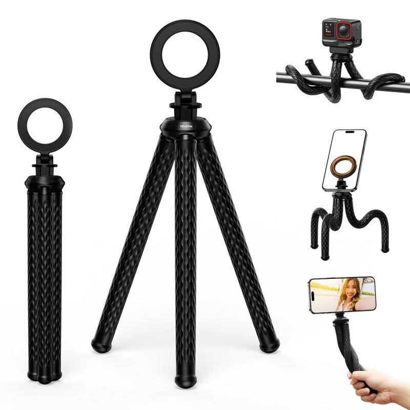 Vastklikken en overal fotograferen. De TELESIN P3-FM-02 combineert een MagSafe-compatibele magnetische ringbevestiging met zachte, met siliconen omwikkelde aluminium pootjes die je om rails kunt buigen, op bureaus kunt balanceren of op een ongelijke ondergrond kunt richten. Een frictiescharnier stelt de kijkhoek in, terwijl je met de verwisselbare 1/4" schroefdraad in een paar seconden actiecamera's, compacte lampen of andere accessoires kunt verwisselen.