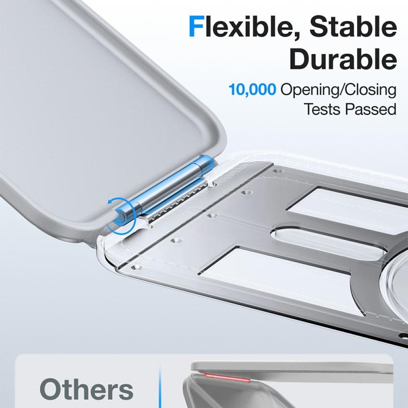 In plaats van een aparte standaard, handgreep en kaarthouder mee te nemen, krijg je drie functies in één accessoire van 40 gram dat in een seconde aan en uit klikt. Het versterkte scharnier en de N52-magneten zorgen voor minder vallen, snellere betalingen en een schonere bureau-inrichting, terwijl het slanke silhouet van je telefoon behouden blijft.