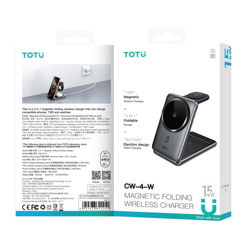 De TOTU CW-4-W maakt meerdere laders overbodig door al je benodigdheden in één apparaat te combineren. Het compacte, opvouwbare ontwerp maakt hem ideaal voor op reis, terwijl snel draadloos opladen ervoor zorgt dat je niet hoeft te wachten. De hoogwaardige bouwkwaliteit garandeert duurzaamheid en stijl, waardoor het een betrouwbare keuze is voor moderne gebruikers.