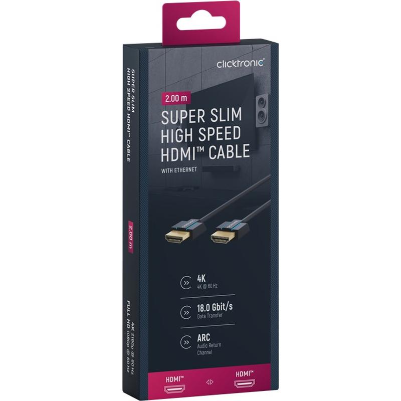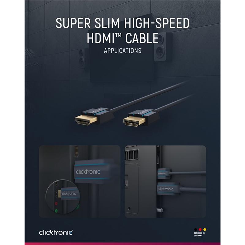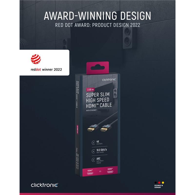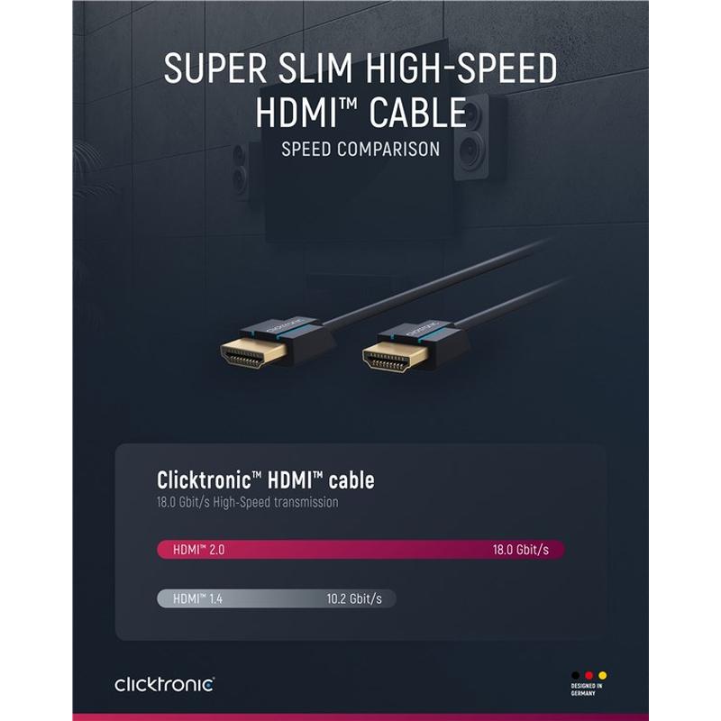 De ultrakleine HDMI™-hoge kabels met een tv-apparaat en monitor tot t.ex. bärbara datorer, projector, beamers of spelconsoles voor PlayStation of Xbox voor film- en game-upplevels. UHD-signaalweergave tot 4K @ 60 Hz (2160p) of Full HD @ 60 Hz (1080p), Extra smalle HDMI™-aansluitkabel voor grote flexibiliteit en maximale weergave tot 18 Gbit/s, 24 karaats vergulde HDMI ™-kontakt en geavanceerde technische garanties zorgen voor verschillende signaalkwaliteiten voor een optimaal spelniveau. Het is mogelijk om 3-voudige opties voor video- en beeldkwaliteit te gebruiken, Clicktronic 4K-kabel met HDMI™ Premium-certificering garandeert de beste kwaliteit. HDMI™-oplossing voor alle liga-functies zoals ARC (audio return channel), HDCP of 3D-innehåll
