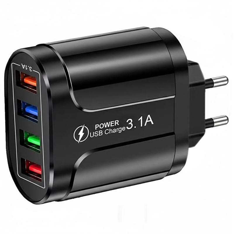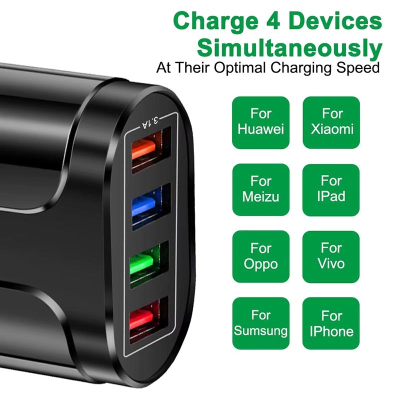 Dankzij de ingebouwde slimme chip laadt de universele 4-poorts USB-lichtnetadapter je apparaten sneller en stabieler op. Hij is uitgerust met 4 USB-uitgangen, zodat je snel tot vier apparaten tegelijk kunt opladen. Door zijn lichtgewicht en compacte formaat neem je hem overal mee naartoe.