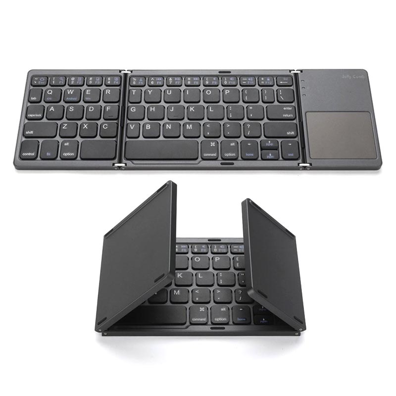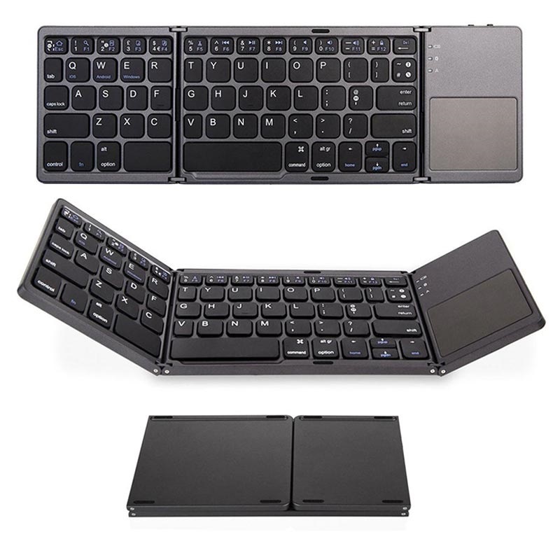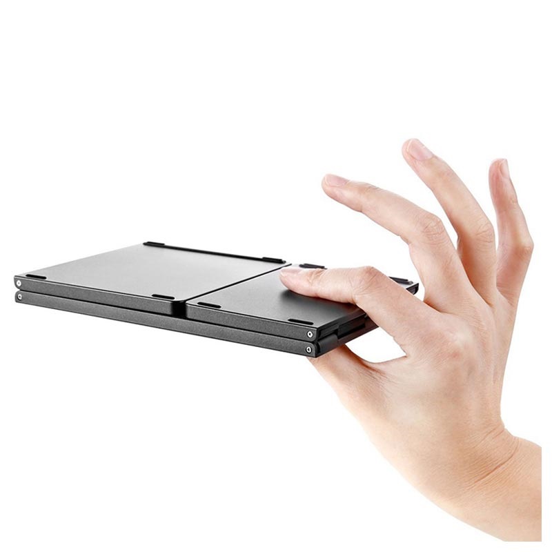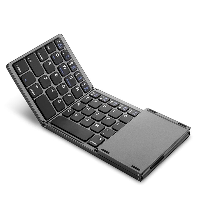 Klein en dun, dit universele Bluetooth-toetsenbord met touchpad kan altijd bij je zijn. Het opvouwbare ontwerp maakt het zeer compact en gemakkelijk overal mee naartoe te nemen. Bluetooth-technologie betekent dat u geen waardevolle USB-poorten met draadloze ontvangers hoeft in te nemen. De configuratie is eenvoudig en er zijn geen installatie of stuurprogramma's vereist. Dit ultradunne dubbelgevouwen toetsenbord past zich gemakkelijk aan je tas aan en de toetsen blijven veilig in de duurzame dubbele vouwconstructie.