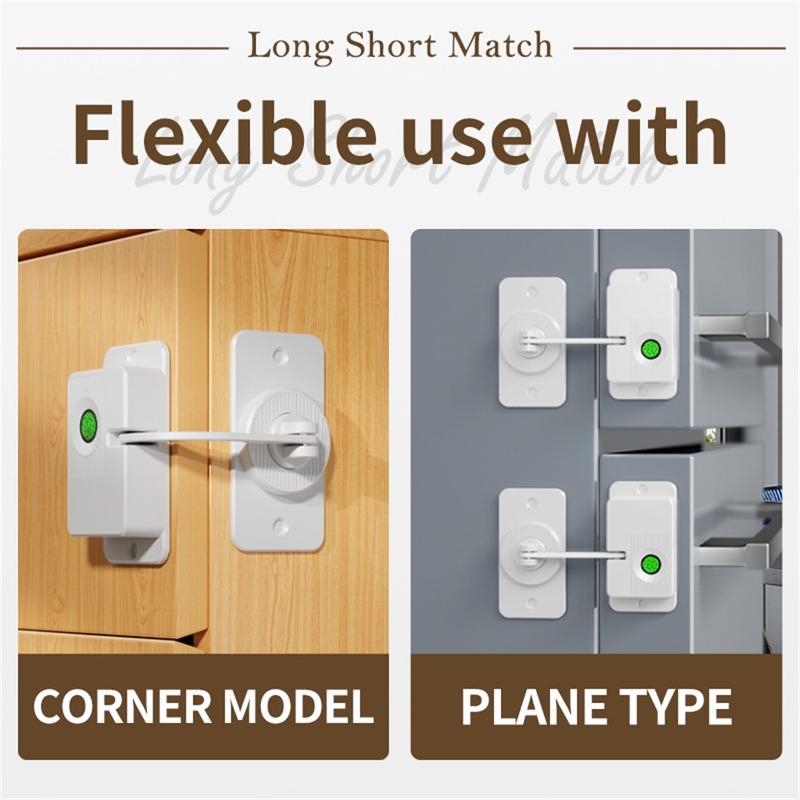 Het V86 kinderslot met vingerafdruk is ontworpen voor veelzijdige bescherming op verschillende huishoudelijke oppervlakken, zoals koelkasten, laden, nachtkastjes, kasten, ramen, wasmachines en archiefkasten. Met zowel zelfklevende installatie (niet boren) en schroefbevestigingsopties beschikbaar, past het zich gemakkelijk aan verschillende opstellingen aan.