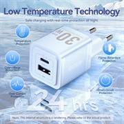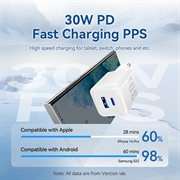 - Dubbele poort uitgang: USB-C (30 W PPS / PD 3.0) en USB-A (30 W QC 4.0 / QC 3.0) voor telefoons, tablets en oordopjes