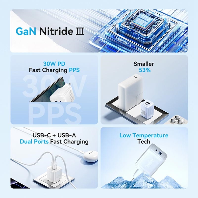 Laad telefoons, tablets en oordopjes op topsnelheid op met één stekker van zakformaat. De VENTION FEQ GaN lader maakt gebruik van de nieuwste galliumnitride componenten om een volle 30 W te leveren via de USB-C of USB-A poort, terwijl hij koeler en kleiner blijft dan de oude stijl silicium stenen. Multi-protocol ondersteuning betekent snelle, veilige stroomvoorziening voor alles van iPhone en Galaxy handsets tot Nintendo Switch en Bluetooth speakers, thuis of onderweg.