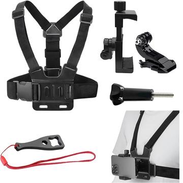 Actioncamera-borstbandbevestiging - verstelbare harnas met draaibare telefoonclip, J-basis en sleutel