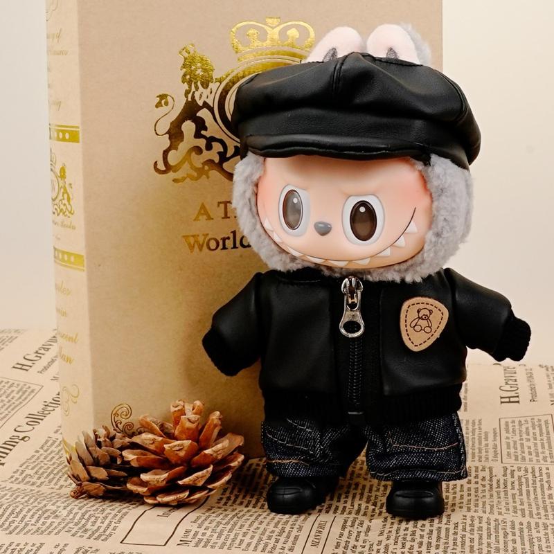 • Vintage Aviator Stijl Outfit Set voor Labubu Doll 17cm - 5 Stuks Verwisselbaar Kostuum met T-Shirt, Jas, Jeans, Hoed & Schoenen voor Gen 1 / 2 / 3 Figurines