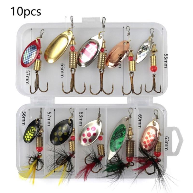 De visspinset bevat 10 hoogwaardige metalen pluggen die zijn ontworpen om vis aan te trekken met hun roterende paillettenactie en realistische bionische uiterlijk. De set is compact en gemakkelijk mee te nemen en wordt geleverd in een handige opbergdoos - perfect voor vissers die op zoek zijn naar een betrouwbare uitrusting voor onderweg. Elk kunstaas is voorzien van scherpe driedubbele haken die de vangst efficiënter maken en voorkomen dat de vis gemakkelijk ontsnapt.