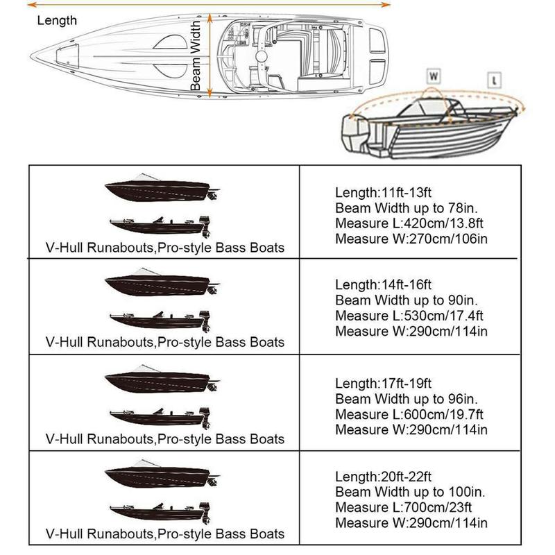 Bescherm je boot in elk seizoen met deze duurzame 210D polyester boothoes met PU-coating voor betrouwbare bescherming tegen regen, zon, stof en dagelijkse slijtage. Ontworpen voor 20-22 ft boten (tot 700 × 290 cm) en een praktische keuze voor opslag, aanmeren en transport. Het geïntegreerde bandensysteem met verstelbare riemen en snelsluitingen houdt de hoes veilig op zijn plaats, terwijl dubbel gestikte naden en een elastische zoom zorgen voor een goede, windbestendige pasvorm rond de romp.