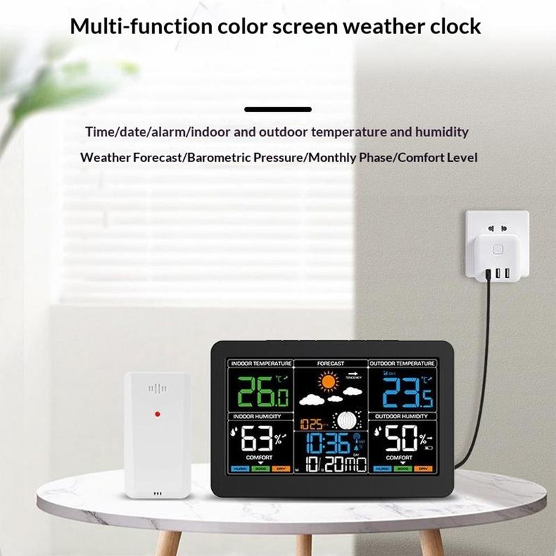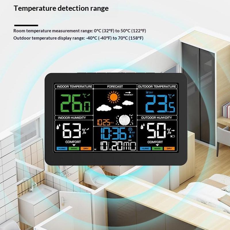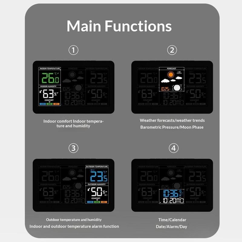 Dit draadloze weerstation combineert tijd, datum, wekker, binnen- en buitentemperatuur, luchtvochtigheidsmeting, weersvoorspelling, luchtdruk, maanfase en weergave van het comfortniveau in één handig apparaat. Met zijn grote kleurenscherm en overzichtelijke indeling is het een handige aanvulling voor de slaapkamer, keuken, kantoor of woonkamer. Zo kunt u belangrijke dagelijkse informatie in één oogopslag bekijken en houdt u uw ruimte overzichtelijker.