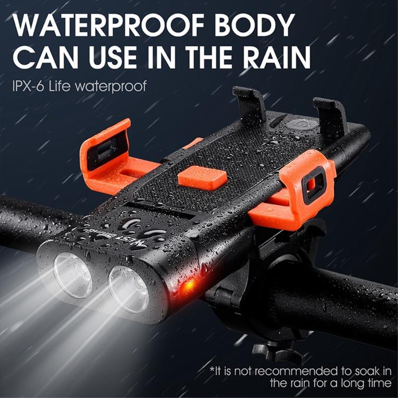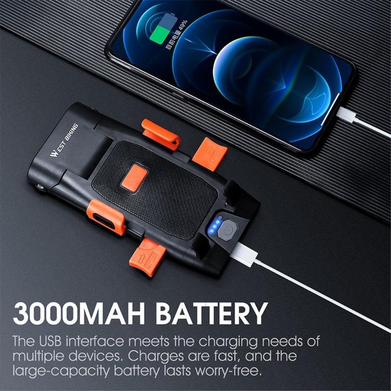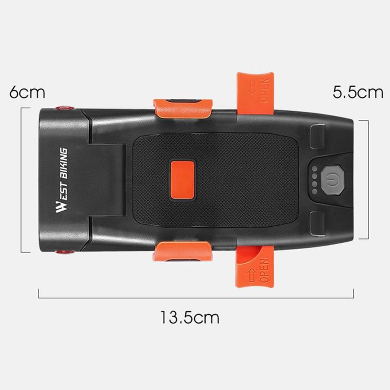 West Biking YP0701321 5-in-1 fietsvoorlicht met telefoonhouder, Power Bank functie, claxon, waarschuwingslicht - 3000mAh, 4,5"-6,5".