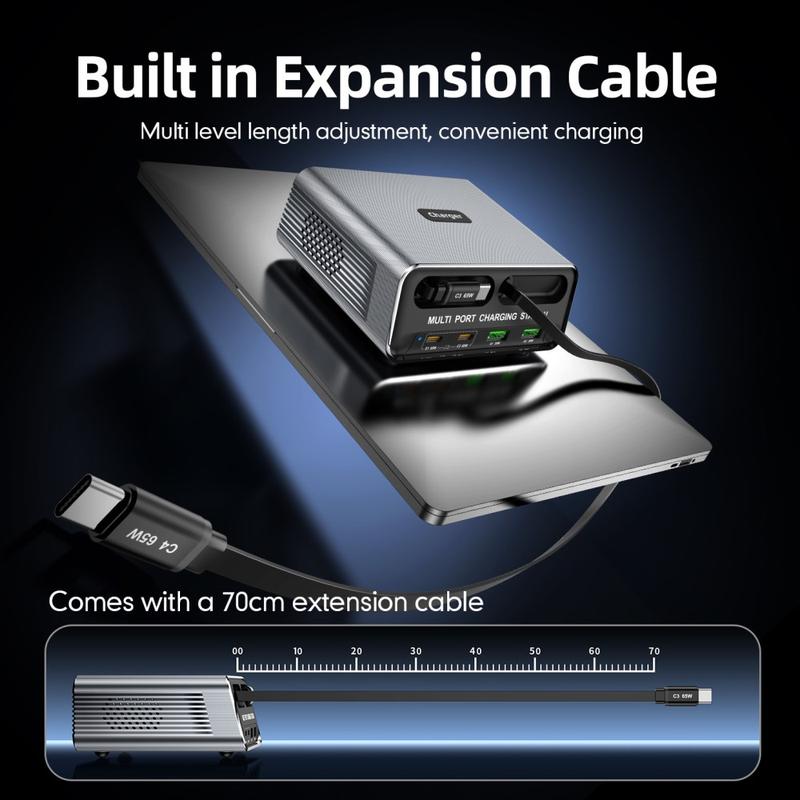 - Geïntegreerd ontwerp met 6 poorten: 2xUSB-C + 2xUSB-A + 2x intrekbare USB-C-kabels