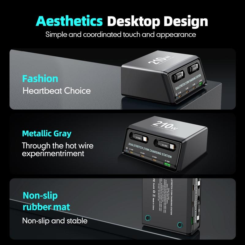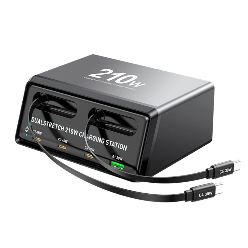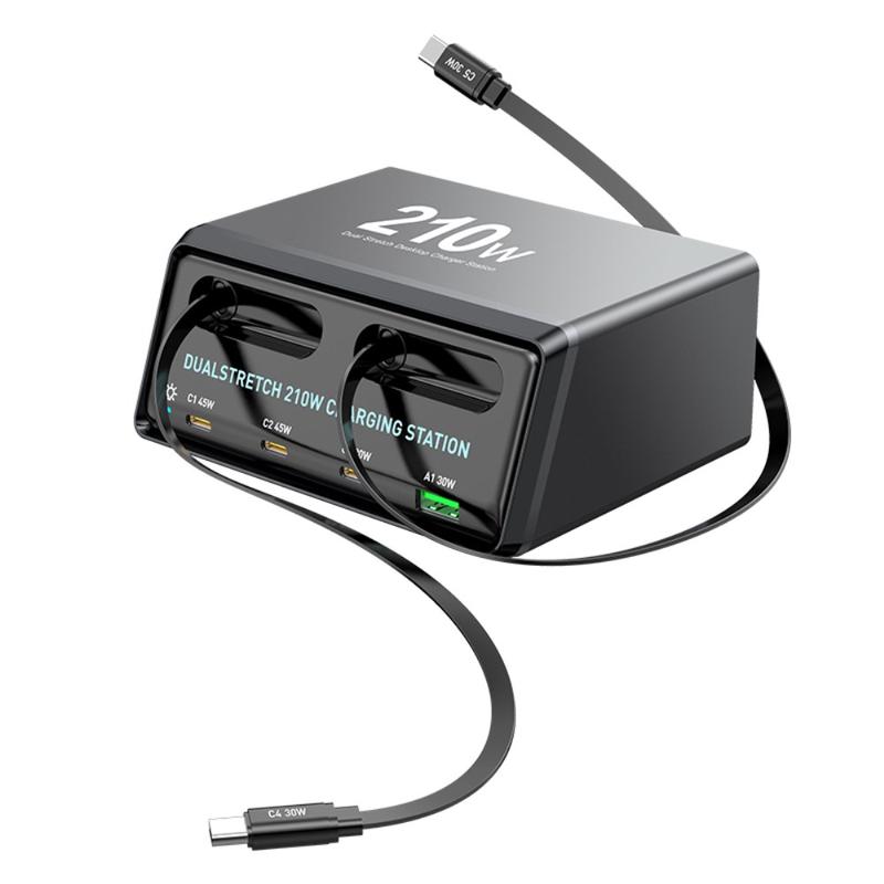 WLX-60E GaN-desktoplader - 2x intrekbare USB-C-kabels + 3x USB-C + USB-A, tot 210W