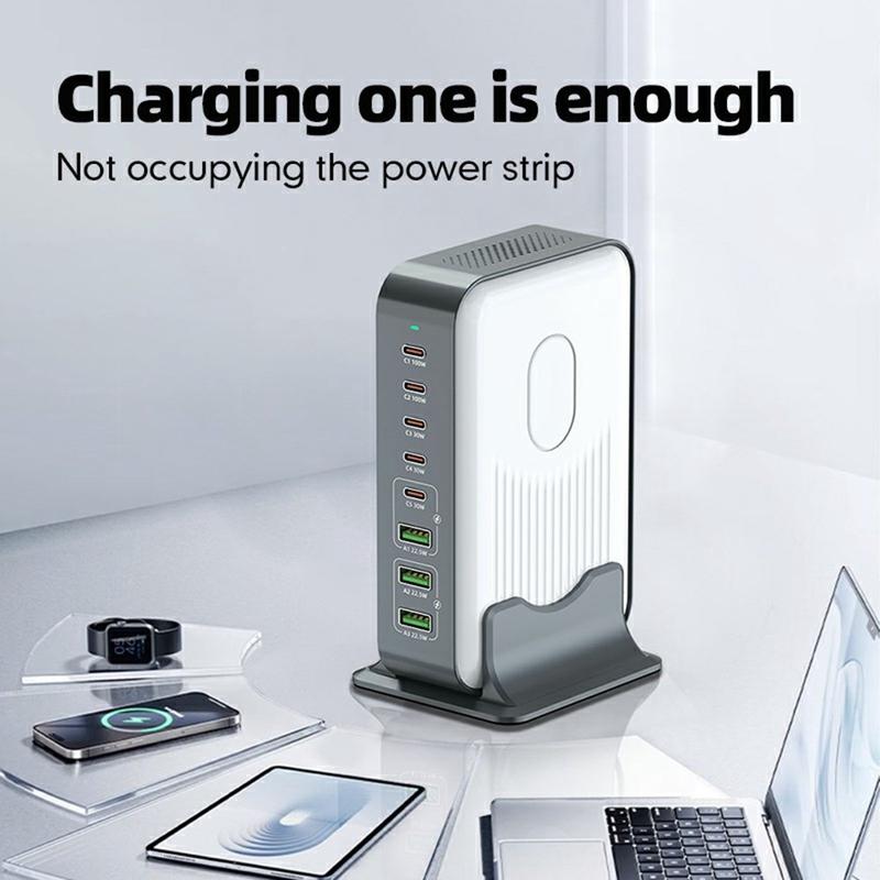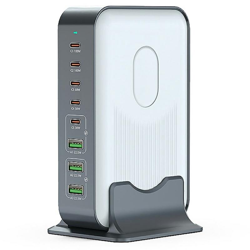 Dit WLX-F8B 200W desktop-oplaadstation is een ultrakrachtige GaN snellaadhub die is ontworpen om meerdere omvangrijke adapters te vervangen door één compacte, efficiënte oplossing. Met vijf USB-C Power Delivery-poorten en drie USB-A Quick Charge-poorten ondersteunt het gelijktijdig opladen van laptops, tablets, smartphones, koptelefoons en game-apparaten - allemaal via één stopcontact.