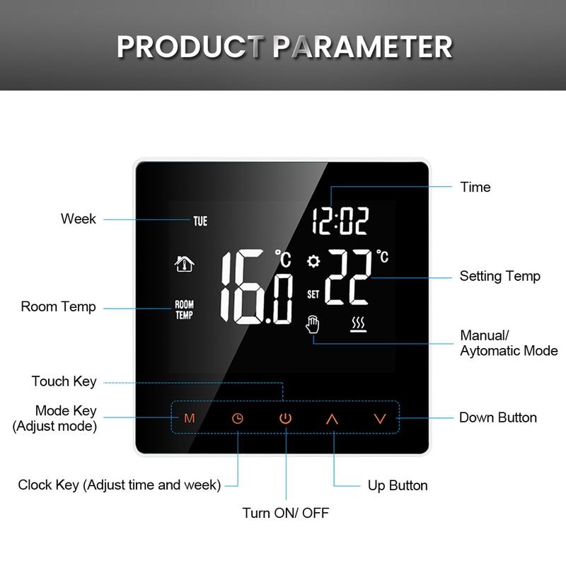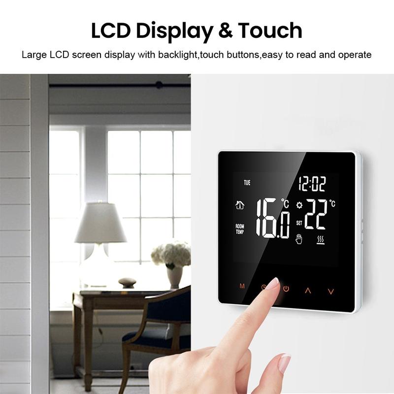 Het grote LCD-touchscreen met achtergrondverlichting is zowel overdag als 's nachts goed afleesbaar. Het elegante ontwerp uit één stuk geeft de thermostaat een strakke en moderne uitstraling, terwijl het krasbestendige oppervlak ervoor zorgt dat hij er na verloop van tijd nog steeds representatief uitziet. U kunt kiezen tussen de handmatige modus voor directe aanpassing en de automatische modus voor geprogrammeerde verwarming, afhankelijk van uw dagelijkse routine en persoonlijke voorkeuren.