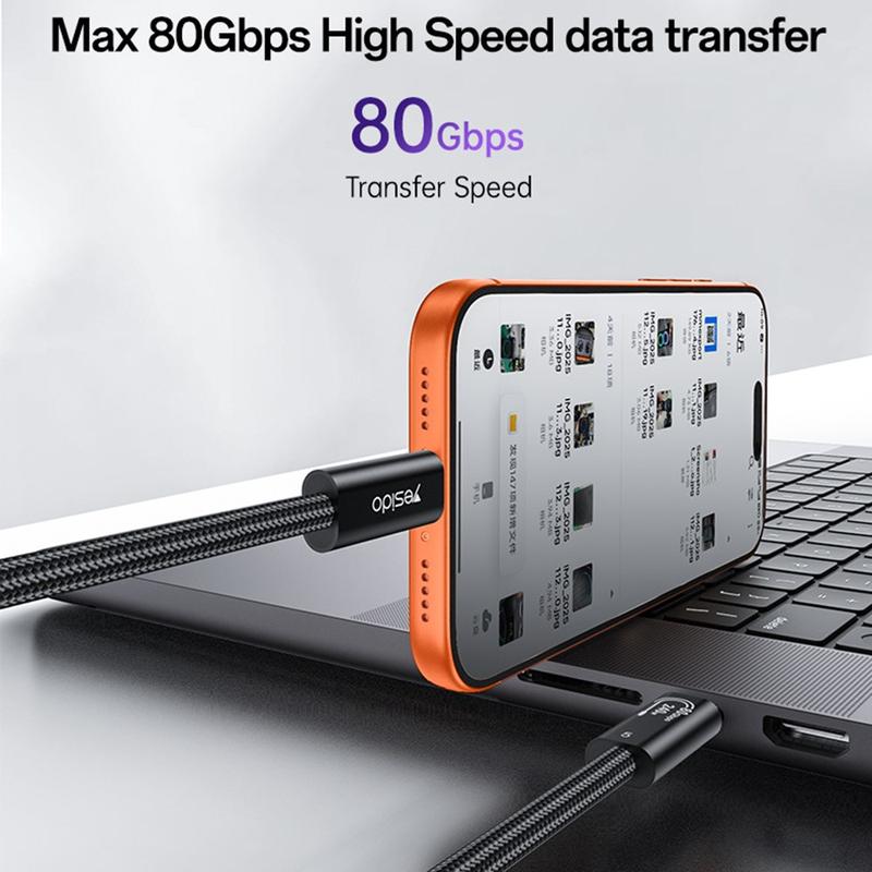 Met ondersteuning voor een overdrachtssnelheid tot 80 Gbps is de Yesido CA211 geschikt voor snelle bestandsoverdracht, gegevensback-ups en efficiënte synchronisatie van grote bestanden. Hij ondersteunt ook opladen tot 240W, waardoor compatibele apparaten met een hoog vermogen kunnen worden opgeladen in combinatie met een geschikte oplader en ondersteunde hardware. Voor gebruik met beeldschermen ondersteunt de kabel videotransmissie tot 16K@60Hz, waardoor het een uitstekende optie is voor geavanceerde visuele opstellingen en externe beeldschermen met hoge resolutie.