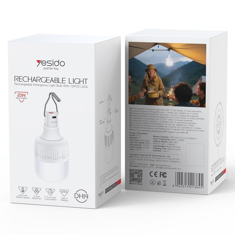 Wees voorbereid op avonturen in de buitenlucht en onverwachte stroomstoringen met de oplaadbare noodlamp YESIDO DH14. Deze draagbare hanglamp zorgt met 12 hoogwaardige LED-lampjes voor een heldere 360°-verlichting en is daarmee ideaal voor kamperen, avondmarkten, noodsituaties thuis of tijdelijke verlichting in de buitenlucht.
