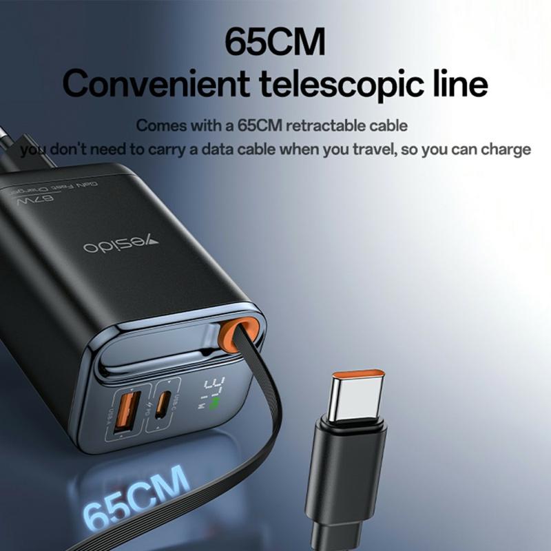 Yesido YC100 67W snelle oplader met intrekbare Type-C kabel - USB-A en USB-C GaN oplaadadapter - EU-stekker