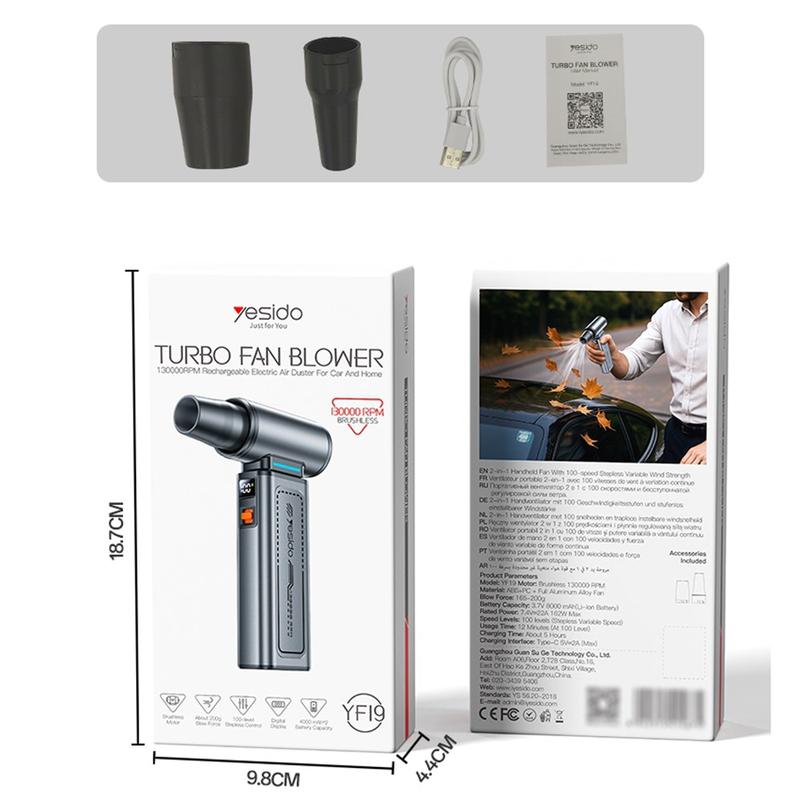 De YESIDO YF19 combineert industriële kracht met alledaags gebruiksgemak. Of je nu elektronica schoonmaakt, stof verwijdert uit kleine ruimtes of buiten koelt, deze compacte krachtpatser levert uitzonderlijke veelzijdigheid en prestaties in één apparaat.
