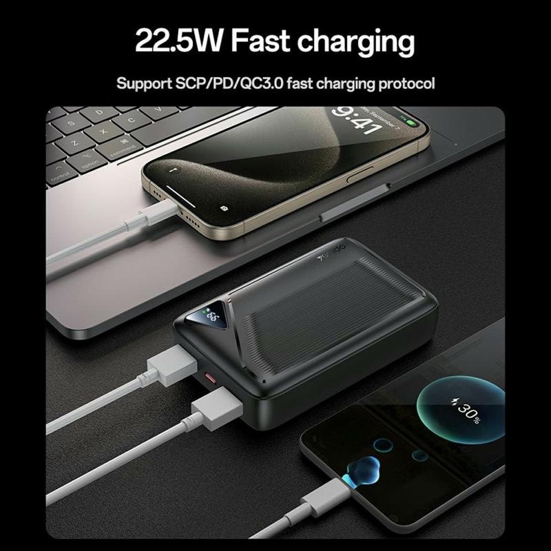 Deze powerbank combineert snellaadtechnologie, veiligheid en draagbaarheid in één slank pakket. Het intelligente energiebeheersysteem zorgt voor optimale efficiëntie, terwijl het LED-display je volledige controle geeft over de batterijstatus. Hij is ontworpen voor moderne gebruikers en levert sterke prestaties in een slank, zakvriendelijk formaat.