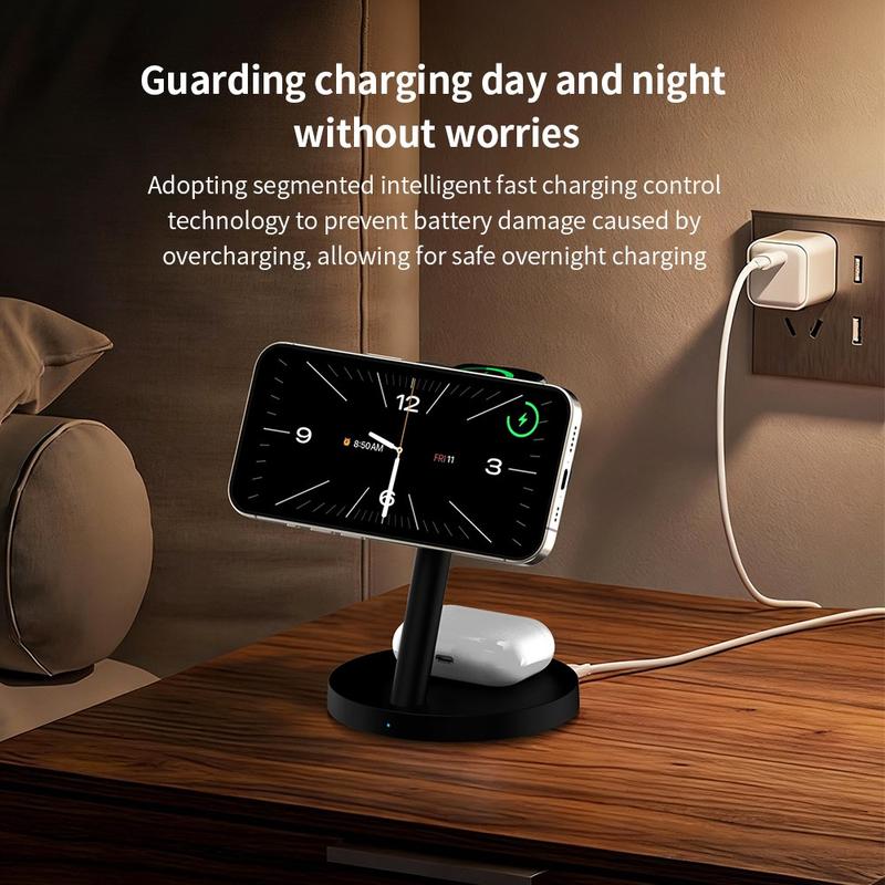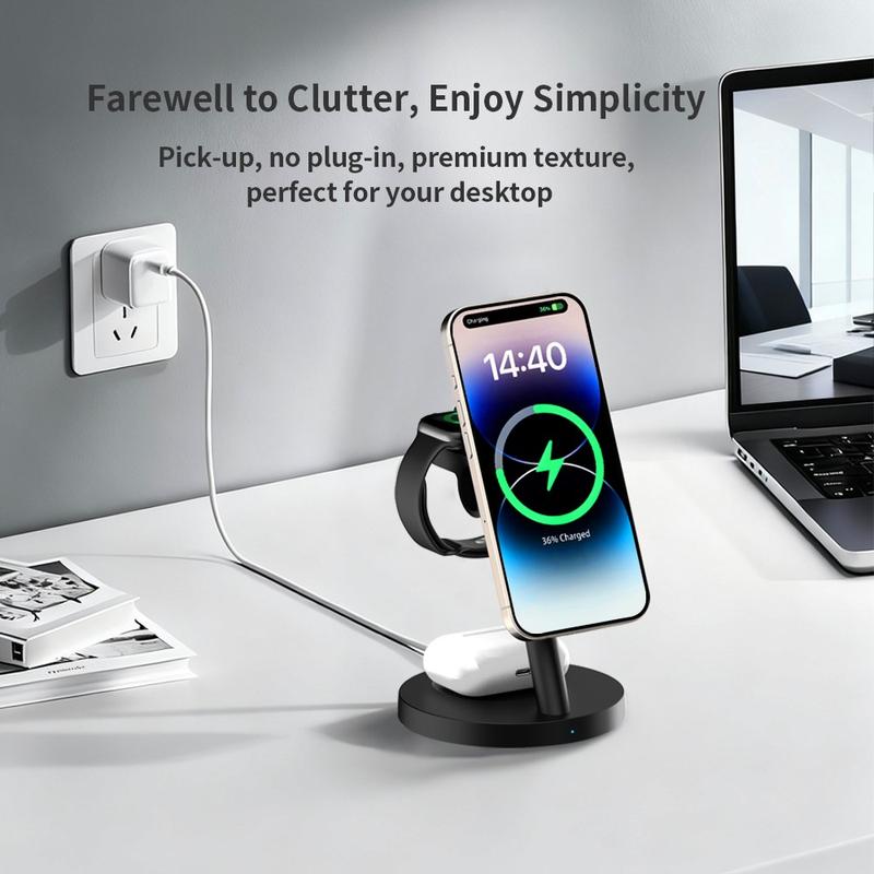 De ZJ05 is een handig alles-in-één oplaadstation waarmee je je dagelijkse apparaten op één overzichtelijke plek kunt opladen. Je kunt er je telefoon, smartwatch en draadloze oordopjes tegelijkertijd mee opladen, terwijl de magnetische telefoonhouder compatibele apparaten op hun plaats houdt voor eenvoudiger opladen. Met een vermogen tot 25W voor telefoons en een verstelbaar ontwerp is het een slimme keuze voor je nachtkastje, bureau of woonkamer.