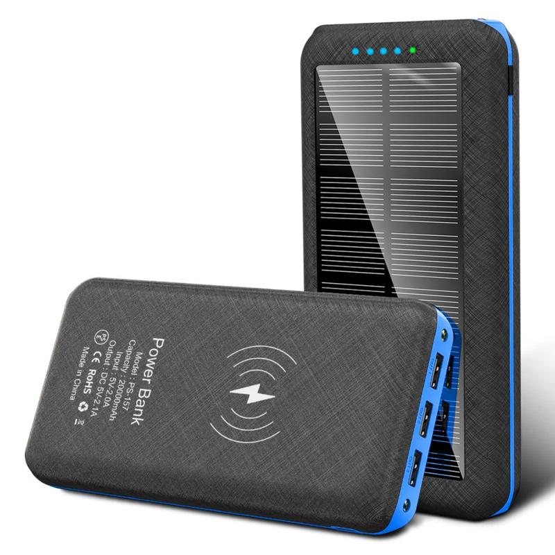 Zonne-energiebank 20000mAh met draadloos opladen, 3x USB-poorten, dubbele LED zaklamp